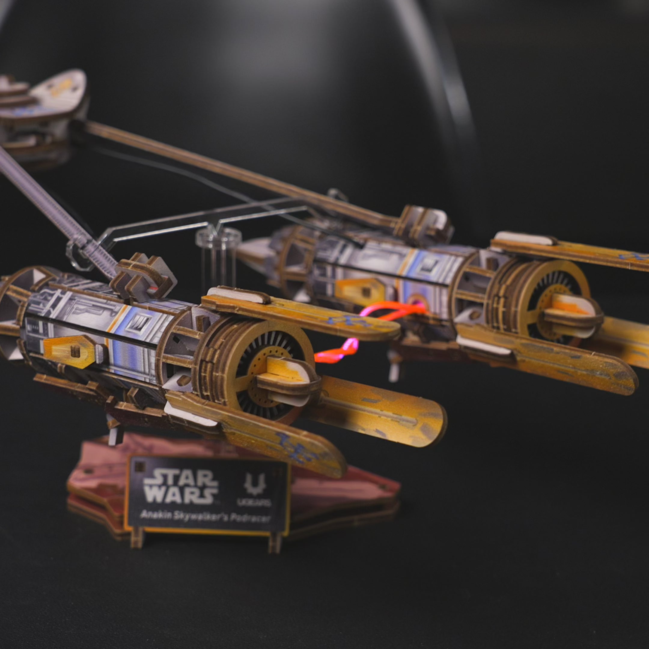 Anakin Skywalkers Podracer von Ugears fängt die Spannung des Podracings ein – mit einem einzigartigen Balanciermechanismus, der das Fahrzeug kippen, schwanken und wenden lässt und so den schwebenden Flug simuliert. Anakin Skywalker sitzt im Cockpit, deren Seitentür manuell geöffnet werden kann.